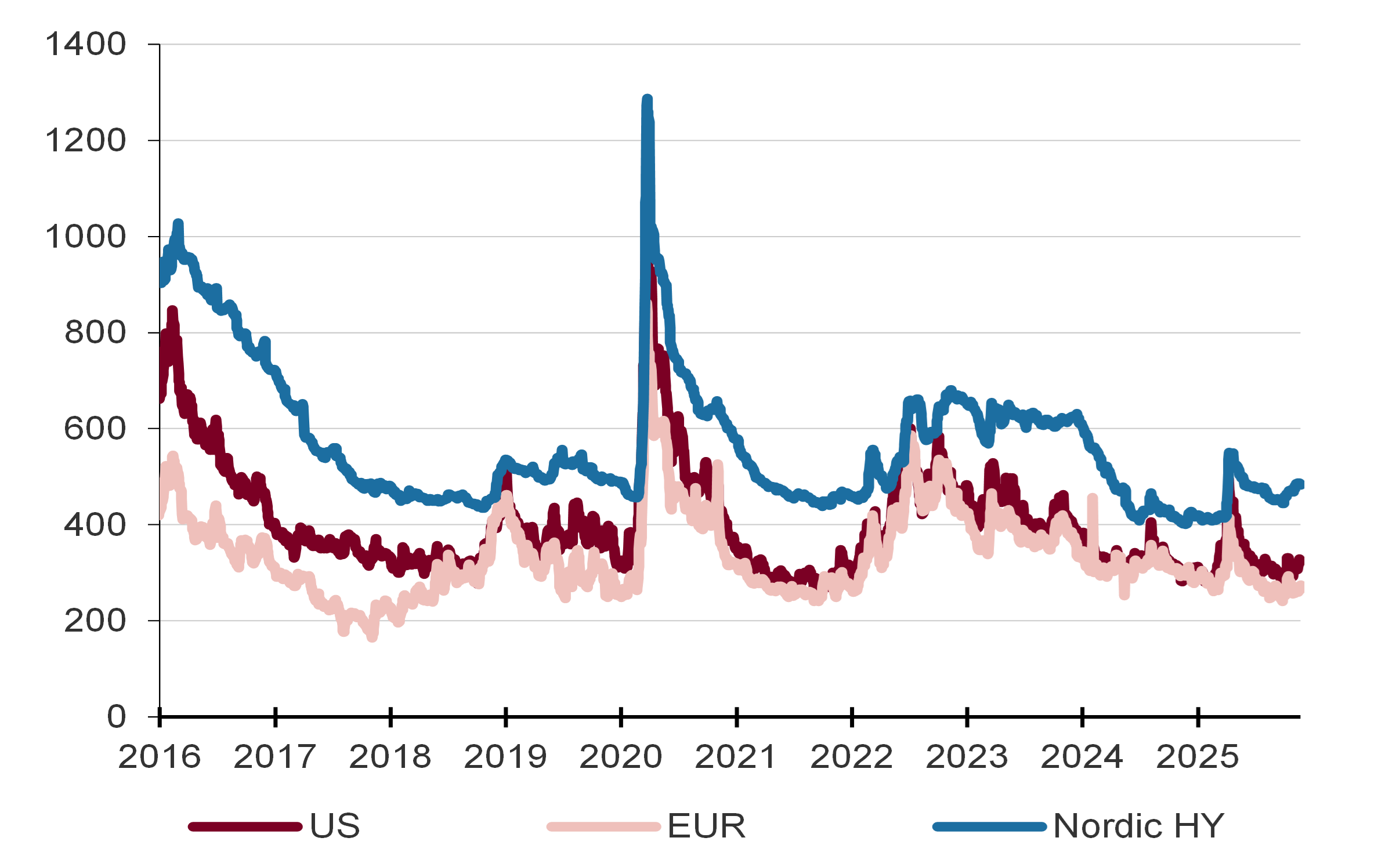 Kredittspreadene er noe dyre, noe som gjenspeiler god økonomisk vekst, sterke balanser og lavere renter. Imidlertid har sterk spreadkomprimering gjort noen markedsektorer—som subordinert gjeld—ganske dyre, noe som krever forsiktighet. Den viktigste effekten av stigende refinansieringskostnader på misligholdsrater ser ut til å være bak oss. Renteøkningene i 2022/2023 førte til høyere mislighold i nordisk high yield sent i 2023 og 2024, spesielt innen eiendom og høyt belånte selskaper. Etter hvert som rentene har lettet og selskapene har justert seg, har misligholdene hatt en nedadgående trend i 2025, med gode recovery rates. Vi forventer at misligholdene vil fortsette å synke det kommende året.